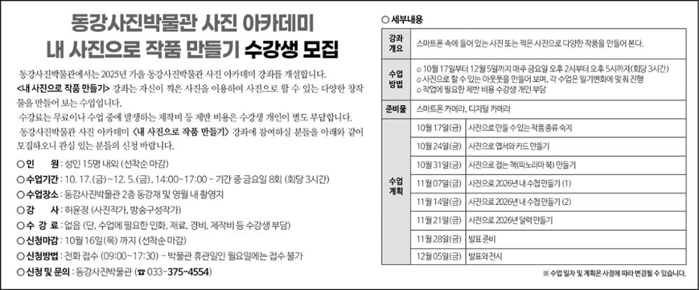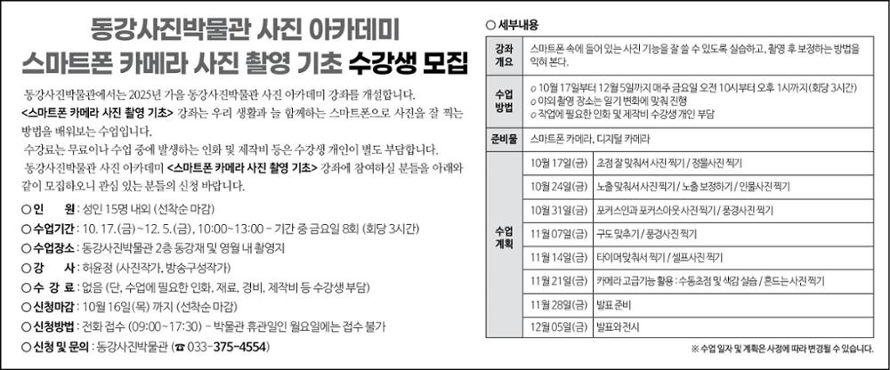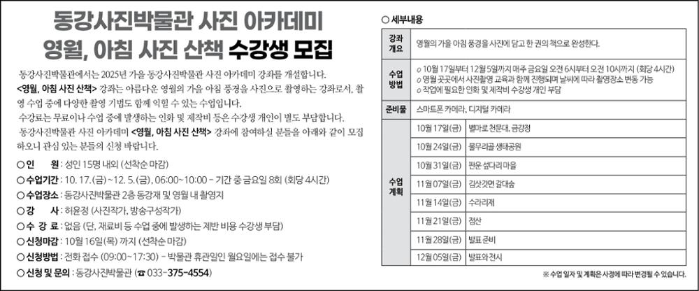 2025년 하반기 동강사진박물관 사진 아카데미 수강생 모집