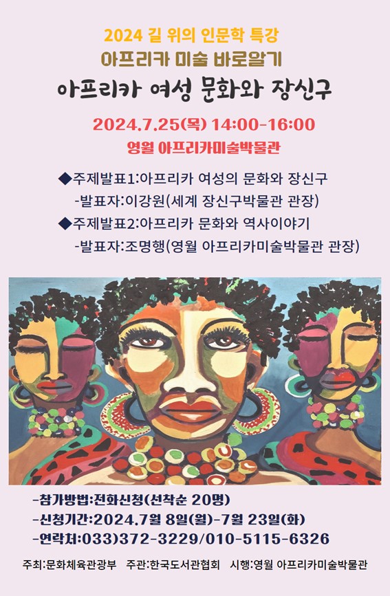 영월 아프리카미술박물관(관장 조명행)은 2024년 7월 25일(목)오후 2시부터 4시까지 박물관 교육관에서 “2024 길 위의 인문학 특강”을 개최한다. 최근 아프리카 문화와 예술에 대한 관심이 높아지고 있는 가운데 이번 특강에서는 ‘아프리카 여성 문화와 장신구’ ‘아프리카 문화와 역사이야기’에 대해 자세히 알아보는 시간을 갖을 예정이다. 첫 번째 특강으로 이강원 세계 장신구박물관 관장은 아프리카 여성들의 장신구는 그들의 정체성과 문화적 의미, 다양한 재료와 디자인으로 만들어 여성들의 아름다움과 다양성을 표현하고 있다. 이들이 사용하는 장신구의 종류와 의미 그리고 그 뒤에 숨겨진 이야기들을 알려줄 예정이다. 두 번째 특강에는 조명행 영월 아프리카미술박물관장이 세계에서 가장 오래된 인류의 발상지 중 하나로 다양한 문화와 역사를 가지고 다양한 인종과 언어가 공존하면서 지역마다 독특한 문화와 전통 등에 대해 자세하게 이야기하는 시간을 마련한다. 이번 특강은 아프리카 문화에 관심이 있는 모든 분에게 좋은 기회가 될 것이다. 아프리카 여성들의 아름다움과 다양성을 경험하며 그들의 문화와 장신구에 대한 이해를 높일 수 있는 시간이 될 것이다.